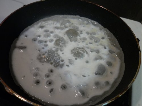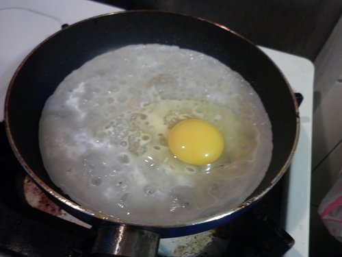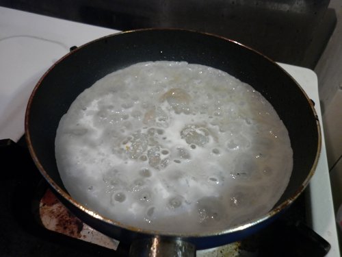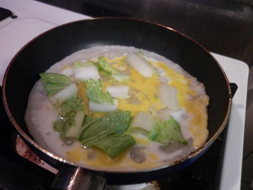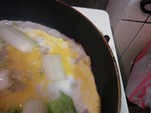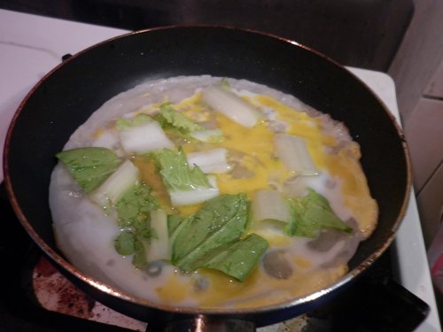 大約煎到5~10秒即可(時間要比蚵仔短),倒下2/3碗的蚵仔粉料水,此時耐心的等候讓他由透明到半透明,