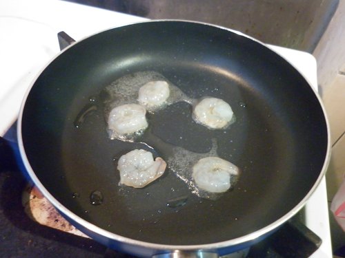熱平底鍋緊接著下油(夜市用豬油)在家可以用健康一點的油,等到油溫微升即可將蝦仁瀝乾下鍋煎!