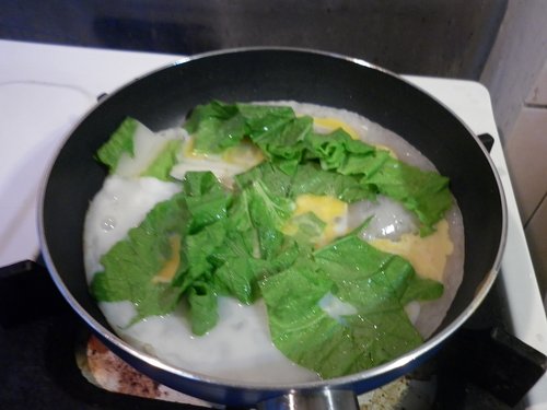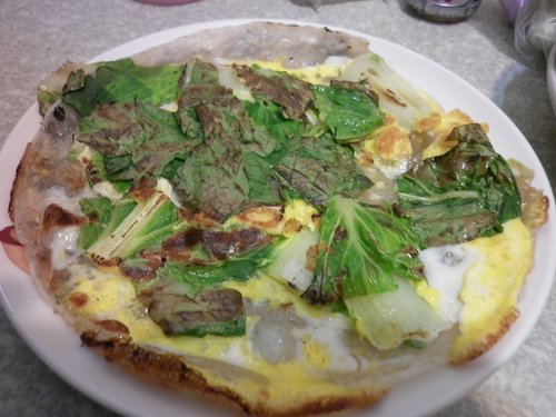 等到出現氣孔後約2~3分鐘,請將雞蛋打下務必將但活打破平舖,最後鮮下葉菜類的梗部,在耐心等候到邊緣有稍許的焦黃後下全部的葉菜,即可翻面,翻面的時程就看各位想要多熟了!如果嫌剛剛下面底部不夠焦可以追加一點油,翻回來加大火即可!輕輕鬆鬆成本不用100元可做5~6份!市價300元的蝦仁煎!